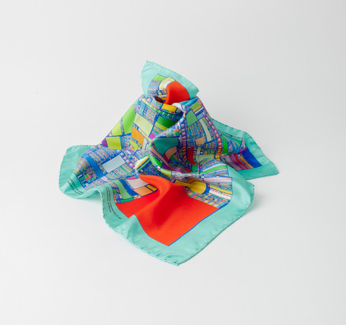 Das Seidentuch mit dem Motiv „Patrick“ zeigt auf 90×90 cm einen Ausschnitt aus einem Chip des Summit Supercomputers von IBM.